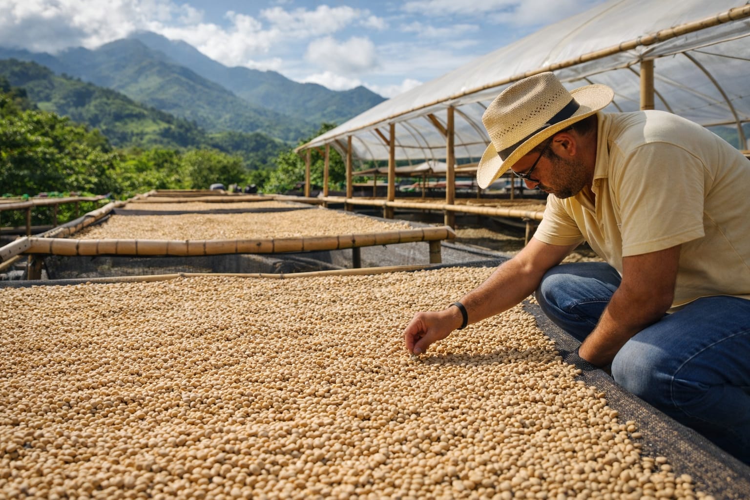Here you will observe how coffee beans are carefully spread out under the sun on large surfaces to naturally reduce their moisture. During this process, the coffee is constantly moved to ensure even drying.